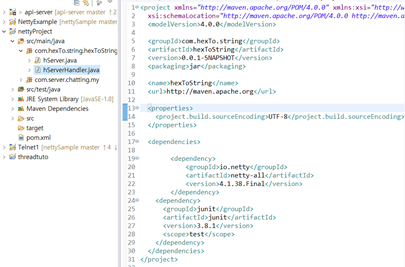 이클립스 실행 -> 메이븐 프로젝트 생성 -> hServer.java, hServeHandler.java 생성 -> pom.xml에 netty dependency 추가