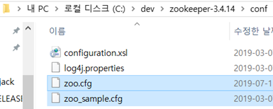 C:\dev\zookeeper-3.4.14\conf 경로에 있는 zoo_sample.cfg 복사 붙이기 -> 복사본 이름 zoo.cfg로 변경 ->