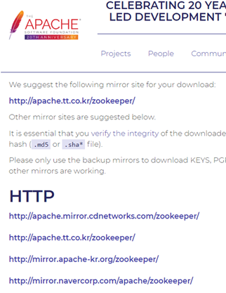 http://www.apache.org/dyn/closer.cgi/zookeeper/ 링크 클릭(컨트롤 클릭) -> 공식 다운로드 사이트 or 미러 사이트 에서 zookeeper 압축 파일 다운로드 -> 압축 해제 ->