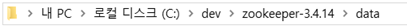 경로확인 ( ex) C:\dev\zookeeper-3.4.14 )-> data 경로 생성 ( ex) C:\dev\zookeeper-3.4.14\data) ->