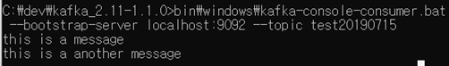 bin\windows\kafka-console-consumer.bat --bootstrap-server localhost:9092 --topic test20190715 입력 -> 아무 변화가 없어야 정상 ->