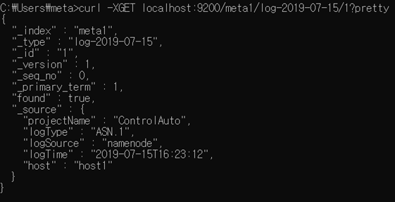 curl -XGET localhost:9200/meta1/log-2019-07-15/1?pretty 입력
