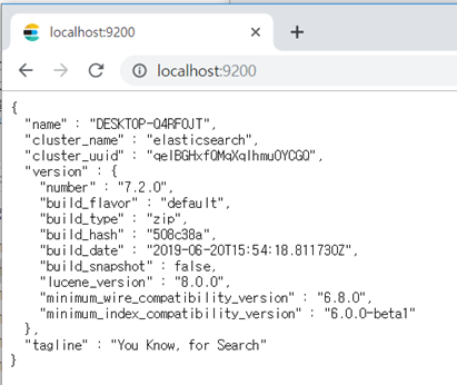 설치경로 ( ex) C:\dev\elasticsearch-7.2.0\bin) 에서 elasticsearch.bat 실행 -> 브라우저에서 http://localhost:9200/ 로 접속