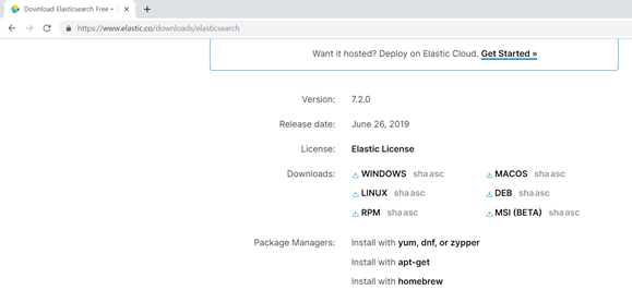 https://www.elastic.co/downloads/elasticsearch 링크 클릭(컨트롤 클릭) -> 공식 다운로드 사이트 or 미러 사이트 에서 엘라스틱서치 압축 파일 다운로드 -> 압축 해제 ->