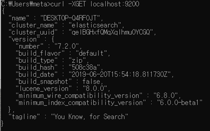 시작 -> 검색 -> cmd실행 -> curl –XGET localhost:9200 입력