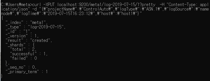 curl -XPUT localhost:9200/meta1/log-2019-07-15/1?pretty -H "Content-Type: application/json" -d "{\"projectName\":\"ControlAuto\",\"logType\":\"ASN.1\",\"logSource\":\"namenode\",\"logTime\":\"2019-07-15T16:23:12\",\"host\":\"host1\"}" 입력